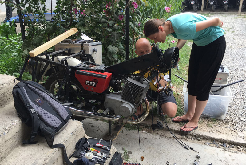 Ich ziehe mich erst mal in eine Ecke zurück und lasse Tränen laufen – vor Erleichterung und Freude über die Hilfe aller. Nach dem wir zuversichtlich sind, dass unser Emmenreiter-Abenteuer weitergehen kann, informieren wir Familie und Freunde über den Zwischenfall. Dann folgt eine schweißtreibende Schrauberwoche für Micha unter der heißen Sonne von Osch. Ich assistiere und fiebere mit. Als das Motorrad wieder wie ein Motorrad aussieht, müssen nur noch die Kofferträger und Koffer zurechtgebogen werden. Am Ende braucht leider auch noch die Schwinge eine Korrektur, denn das Hinterrad steht nicht gerade. Und endlich macht Micha eine kurze Probefahrt. Ich warte und lausche solange. Als er wieder auf den Hof der Werkstatt einbiegt, sehe ich sofort sein Grinsen unter`m Helm. Meine „neue“ Emme hat bestanden.