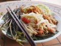 Im Sabaidee-Gasthaus in Thalang haben sich bis zum Abend eine Menge Scooterfahrer eingefunden. Als wir am nächsten Morgen frühstücken wollen, sind fast alle von ihnen schon wieder weitergedüst. Wir bleiben noch einen Tag. Micha spaziert durchs Dorf und die Gegend am Wasser. Er entdeckt immer neue Seiten an dem See. Bevor wir morgens aufbrechen, machen wir noch eine Bootsfahrt in den Sonnenaufgang. Es ist noch windstill und die dunkelgelbe Sonne leuchtet die toten Baumstämme an.