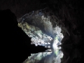 Man kann sich auf einem schmalen Holzboot durch die lange Höhle fahren lassen, die durchweg Wasser führt. Hin und zurück dauert das mindestens zwei Stunden. Der Bootsführer reicht uns Schwimmwesten und Stirnlampen. Bereits der Eingang der Höhle ist gigantisch und ich blicke von hier aus in eine Finsternis, die ich ziemlich mulmig finde. Das Boot fährt zügig hinein. Der Strahl der Stirnlampe des Fahrers, der hinter uns sitzt, schwenkt ständig von links nach rechts an die Felswände. Das Licht ist ziemlich funzelig und ich kann kaum erkennen, wohin wir fahren. Ab und zu leuchten wir an die Decke, die manchmal so hoch ist, dass unser schwaches Licht kaum ihr Ende erreicht. Plötzlich ist ein Teil der Höhle bunt beleuchtet – was für eine Wohltat. An dieser Stelle lässt uns der Bootsführer aussteigen und ein Stück durch die Tropfsteinsäulen laufen. Zurück im Boot fahren wir weiter durch das finstere Wasser. Manche Stellen sind zu flach. Dann müssen wir aussteigen und das Boot ein Stück durchs kalte Wasser ziehen. Micha ist beeindruckt und ich bin froh, als sich endlich das grelle Ende der Höhle abzeichnet. Am Ausgang angekommen umschiffen wir die Wasserbüffel, die im dunkeltürkisen Fluss vor der Mittagshitze abtauchen. Nach einer kühlen Limo geht es den selben Weg zurück. Und ich habe den Eindruck, dass der Bootsfahrer hochkonzentriert noch mal richtig Gas gibt.