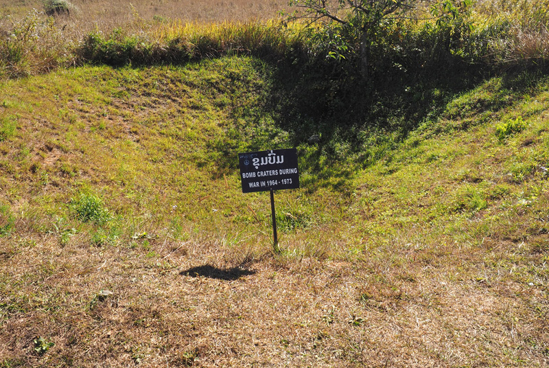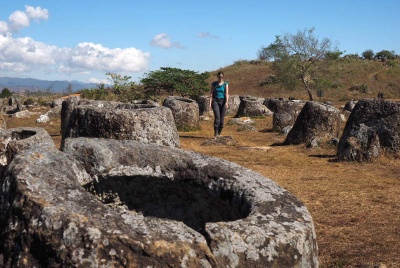 Nach einer einsamen, kurvigen Bergfahrt fahren wir durch die breite, schnurgerade Straße der Provinzhauptstadt Phonsavan. Den Ort gibt es erst seit Ende des Vietnamkrieges und er ist sozusagen am Reißbrett entstanden. Wir sehen Leute in dicken Jacken und Mützen auf dem Kopf herumfahren. Der heutige Tag war wolkig und die Luft ist hier auf 1.200 Metern über dem Meer deutlich kühler als anderswo in Laos. Ziemlich kühl! Als wir abends schlafen gehen, sind wir froh über die dicken Decken auf dem Bett. Wir haben seit Ewigkeiten nicht mehr gefroren. Ich lasse nachts sogar meinen Pulli an. Als wir früh aufwachen, hoffen wir, dass die Sonne bald die Terrasse vor unserem Zimmer erwärmt. Mit Kaputze auf dem Kopf essen wir French Toast zum Frühstück, das ich auf dem Campingkocher gebraten habe. Der klare Himmel verspricht einen sonnigen warmen Tag und wir fahren zusammen auf einer Emme zu den mysteriösen Riesensteinkrügen. Auf mehreren Feldern um Phonsavan liegen sie zu hunderten in der Landschaft umher. Man hatte die großen Gefäße um 1930 herum wiederentdeckt. Sie sollen vor etwa zweitausend Jahren als Graburnen gedient haben. Als wir zwischen den Krügen über die Felder laufen, kommen wir auch an mehreren runden Vertiefungen im Boden vorbei. Es sind Bombenkrater. Die Gegend um Phonsavan wurde in der Zeit des Vietnamkrieges, als es auch innerhalb von Laos zu harten Kämpfen mit prokommunistischen Widerständlern kam, von der US-Armee massiv angegriffen. Im kleinen Besucherzentrum in der Nähe der Steinkrugfelder, das auf das Problem der unzähligen Blindgänger aufmerksam macht, stehen wir wortlos vor einem erschreckenden Plakat. Es zeigt eine Landkarte von Laos, die übersäht ist mit roten Punkten, die wie dicke Blutspritzer auf der Karte kleben. Es sind bombardierte Orte und Regionen. Laos wurde neun Jahre lang alle acht Minuten bombardiert. Pro Einwohner waren es etwa 2,5 Tonnen an Sprengsätzen, die hier bis 1974 förmlich niederregneten. Dieser unglaublich brutale Krieg fand im Geheimen statt. Micha und ich hatten bis heute keine Ahnung davon, dass Laos als meist bombardiertes Land der Welt gilt.