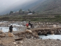 Die Sonne steht schon tief und kühler Wind hat unsere T-Shirts trocken geblasen. Alle frieren und ziehen schnell ihre Jacken und Mützen über. Auf dem letzten Stück bis zur Ankunft am Basislager ist der Trampelpfad entlang am Berg so schmal, dass mir unweigerlich der Gedanke kommt, wie nah wir der Gefahr sind, für immer am Rakaposhi zu verschwinden. Das ist nämlich das wahre Risiko Pakistans: ein kurzer Fehltritt und das war`s. Allerdings wirkt keiner aus der Truppe, die Seppo im Gänsemarsch folgt, zögerlich. Bin ich echt die einzige, die gerade die Trekkinghosen voll hat? Ohne etwas zu sagen gehe ich vorsichtig und demütig hinterher. Ich glaube, alle von uns möchten ihren Rucksack einfach nur noch auf die abgegraste Weidefläche des 3.200 Meter hoch gelegenen Basislagers fallen lassen, etwas warmes essen und in den Schlafsack krabbeln. Nach sieben Stunden bauen wir endlich unsere Zelte auf.
